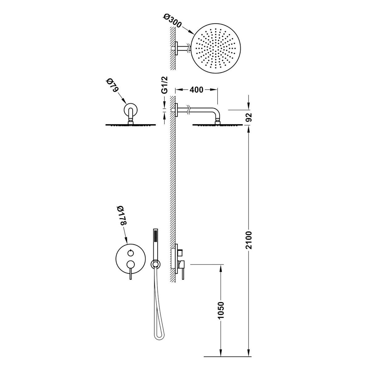 Dane techniczne: - długość ramienia deszczownicy: 400 mm - średnica rozety baterii: 178 mm - przepływ (l/min): 12