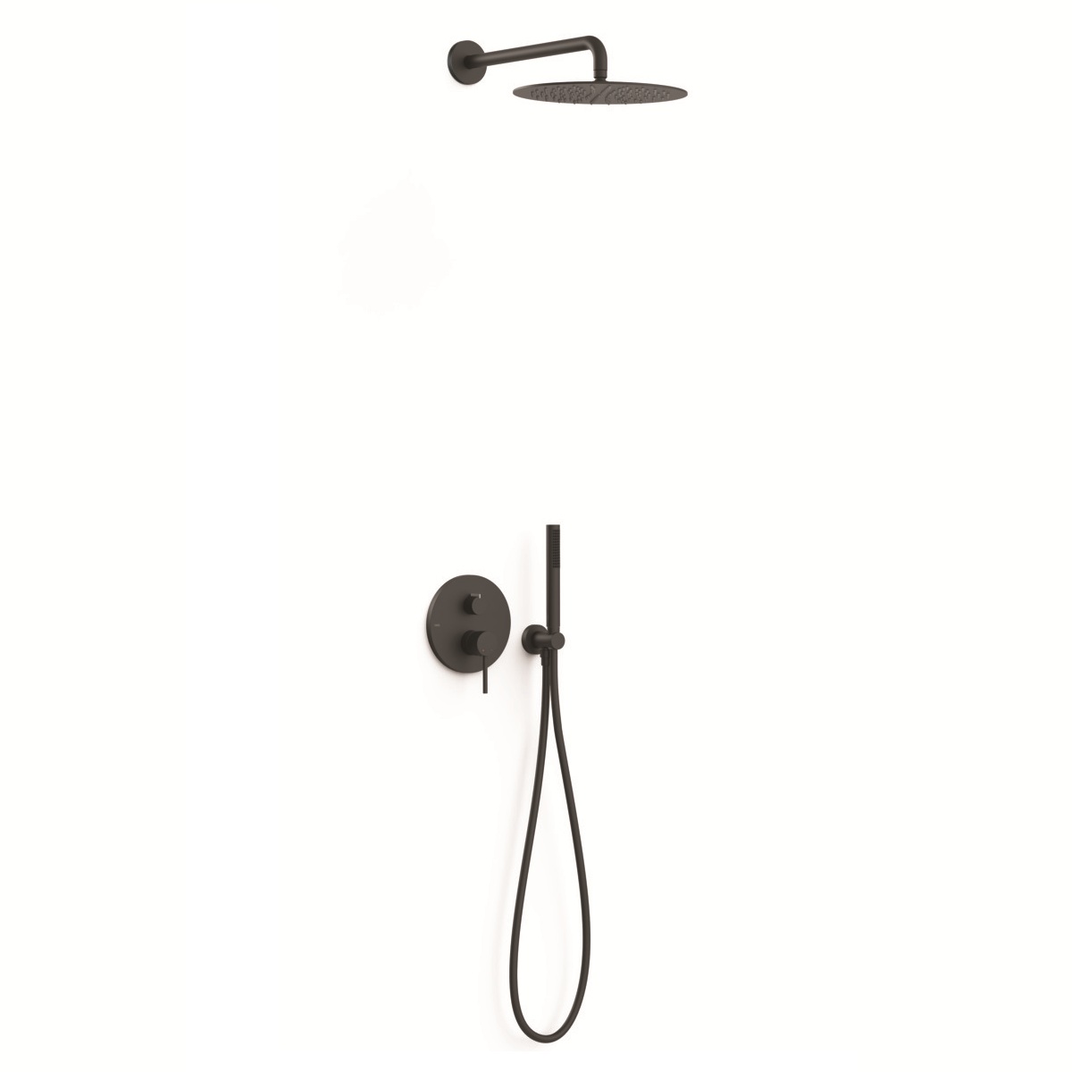 Główne cechy: - kolor: czarny mat - montaż: podtynkowy - typ: jednouchwytowy - rodzaj: natryskowy - przełącznik funkcji 2-drogowy - ramię naścienne z regulowaną deszczownicą ze stali nierdzewnej: Ø 300 mm - uchwyt do słuchawki prysznicowej z przyłączem w ścianie - słuchawka prysznicowa z mosiądzu systemem zapobiegającym osadzaniu się kamienia - satynowy wąż - natrysk ręczny z mosiądzu - sitko ze stali nierdzewnej