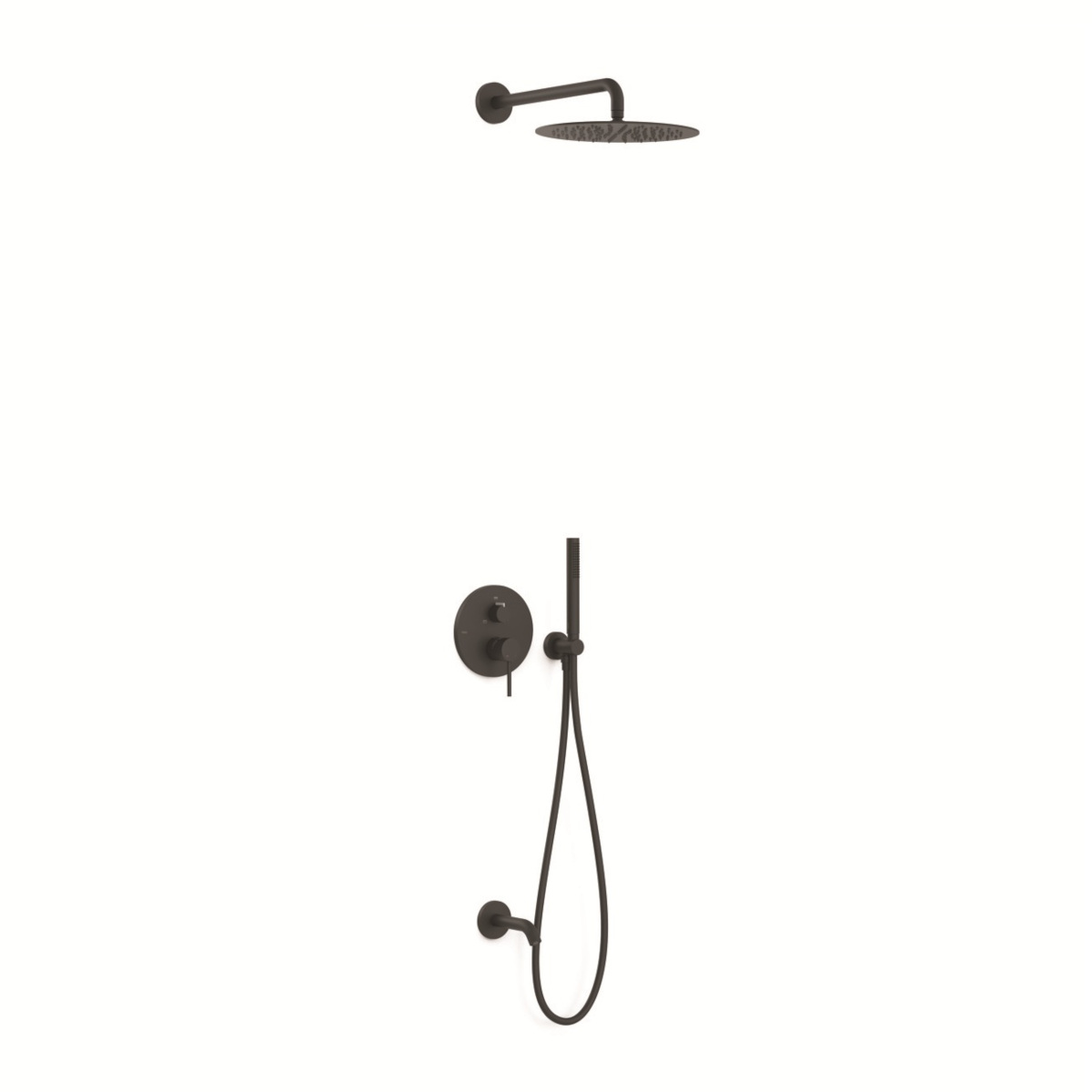 Główne cechy: - kolor: czarny mat - montaż: podtynkowy - typ: jednouchwytowy - rodzaj: natryskowy - przełącznik funkcji 2-drogowy - ramię naścienne z regulowaną deszczownicą ze stali nierdzewnej: Ø 300 mm - wylewka stała naścienna - uchwyt do słuchawki prysznicowej z przyłączem w ścianie - słuchawka prysznicowa z mosiądzu systemem zapobiegającym osadzaniu się kamienia - satynowy wąż - natrysk ręczny z mosiądzu - sitko ze stali nierdzewnej