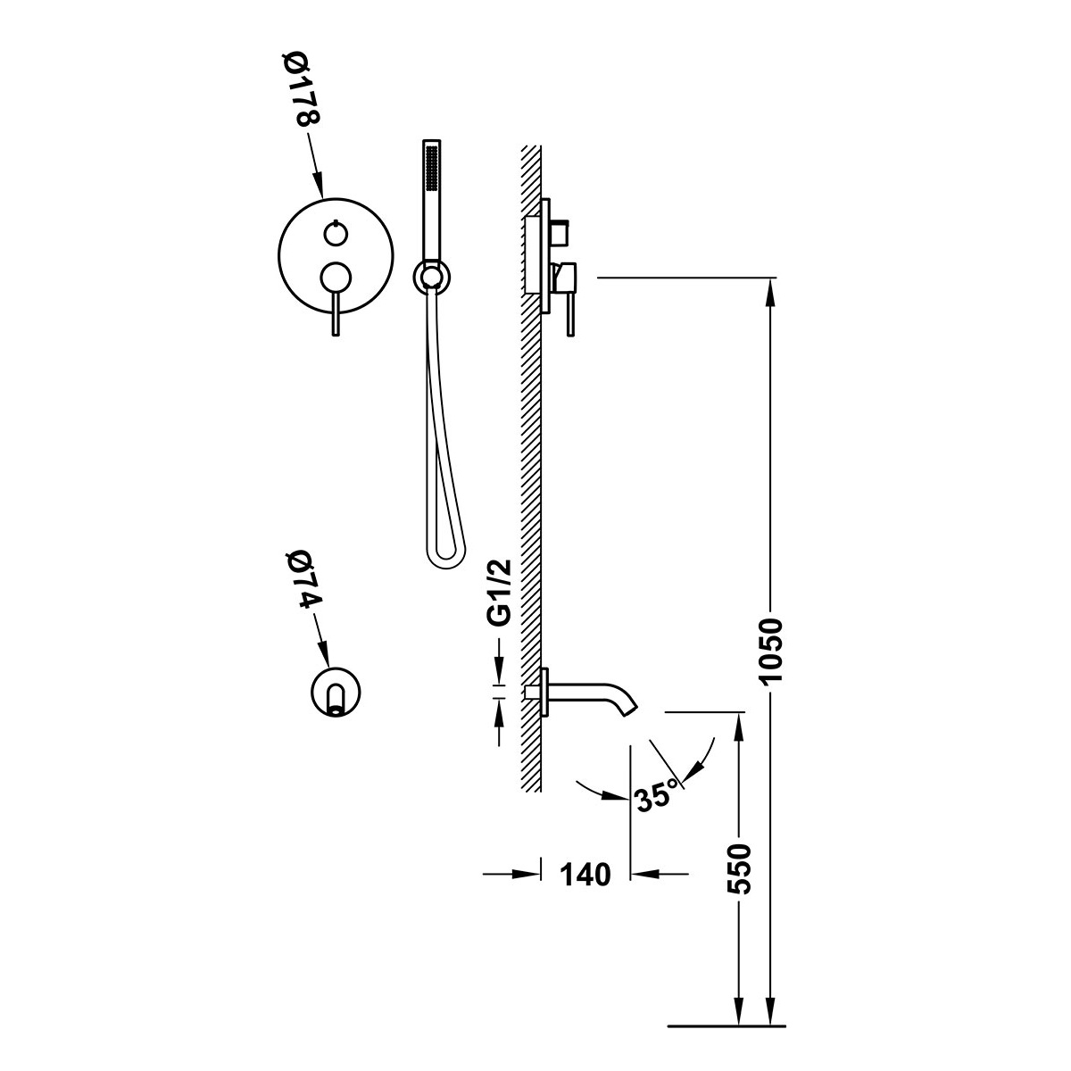 Dane techniczne: - średnica rozety baterii: 178 mm - średnica rozety wylewki: 74 mm - wysokość do wylewki: 550 mm -zasięg wylewki: 140 mm - przepływ: 15 l/min
