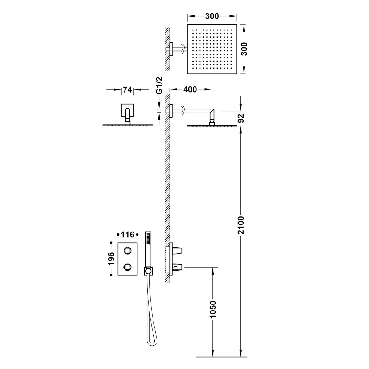 Główne cechy: - kolor: czarny mat - montaż: podtynkowy - typ: jednouchwytowy - rodzaj: natryskowy - pokrętło kwadratowo-okrągłe ze sterowaniem temperaturą oraz pokrętło przełącznika funkcji. - ramię naścienne z regulowaną deszczownicą ze stali nierdzewnej: 300x300 mm. - uchwyt do słuchawki prysznicowej z przyłączem w ścianie. - słuchawka prysznicowa z mosiądzu systemem zapobiegającym osadzaniu się kamienia - satynowy wąż. - sitko ze stali nierdzewnej