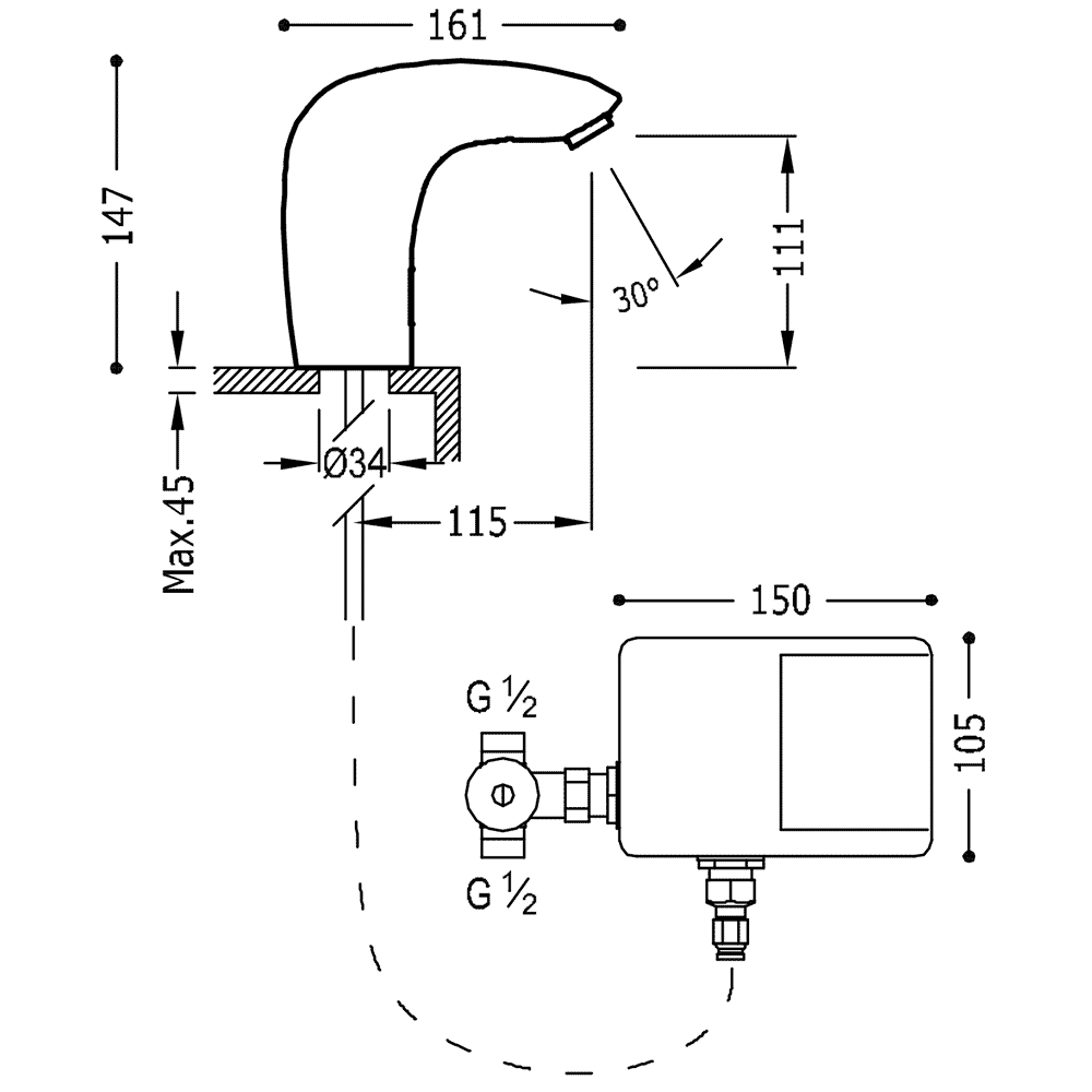 Dane techniczne: - wysokość: 147 mm - długość wylewki: 161 mm - przyłącza: G 1/2