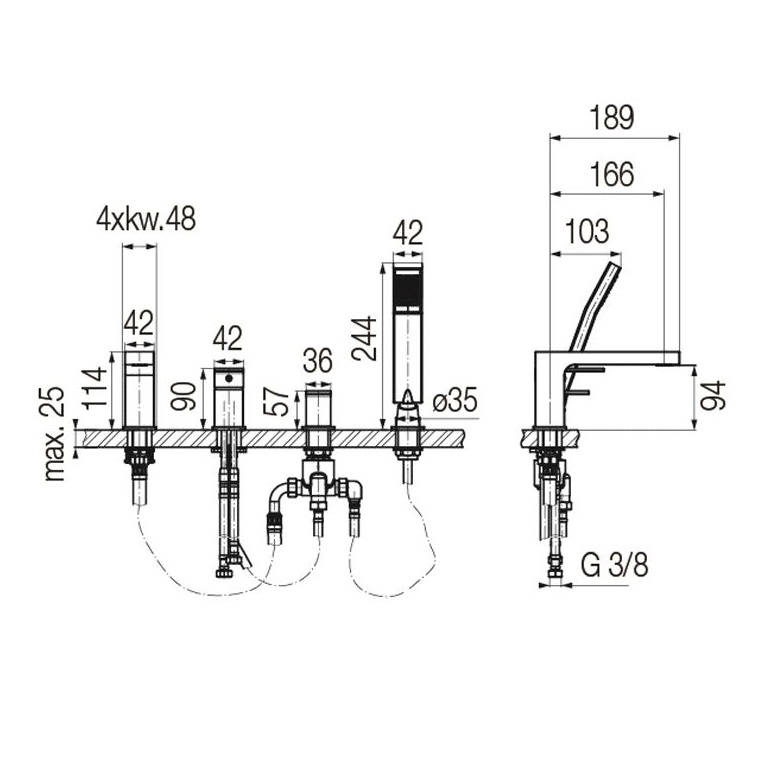 Dane techniczne: - regulator: 35 mm - długość wylewki: 189 mm - wymiary rączki natrysku: 244 x 42 mm - temperatura maksymalna: 90°C