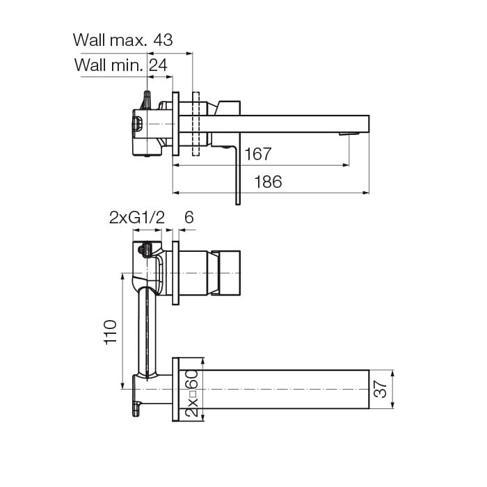 Dane techniczne: - długość baterii: 186 mm - zasięg wylewki: 167 mm - rozstaw przyłączy: 110 mm - przyłącze: G 1/2