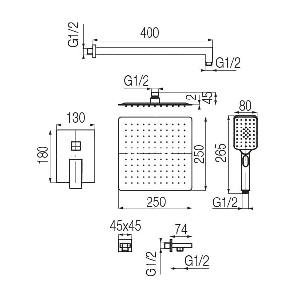 Dane techniczne: - wymiary rozety deszczownicy: 250 mm - długość ramienia deszczownicy: 400 mm - długość słuchawki: 265 mm - wymiary baterii: 180x130 mm - przyłącze: G 1/2