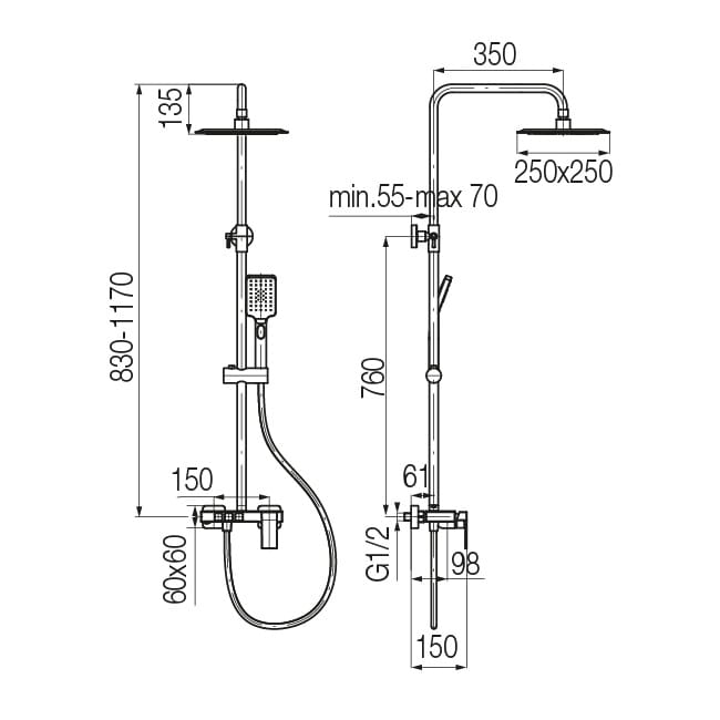 Dane techniczne: - średnica deszczownicy: 250 mm - zasięg wylewki deszczownicy: 350 mm - wysokość zestawu: 830-1170 mm - rozstaw przyłączy: 150 mm - przyłącze: G 1/2