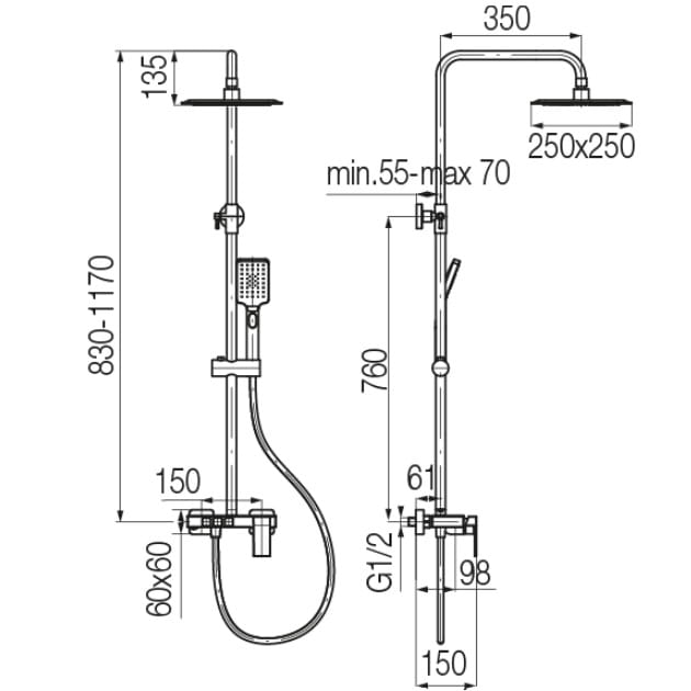 Dane techniczne: - wysokość drążka: 830- 11700 mm - wymiary głowicy natrysku: 250x250 mm