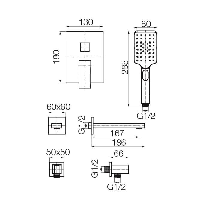 Dane techniczne: - wymiary rozety: 180 x 130 mm - zasięg wylewki: 167 mm - długość wylewki: 186 mm - średnica przyłącza: G1/2 - długość słuchawki: 265 mm