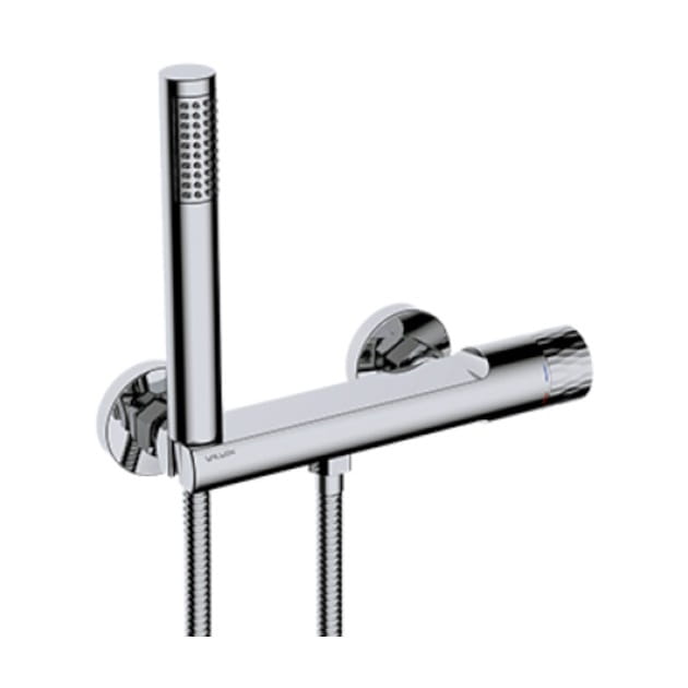 Główne cechy: - kolor: chrom - materiał: mosiądz - rodzaj: natryskowa - typ: jednouchwytowa - montaż: naścienna - stałe ciśnienie wody - bateria z uchwytem natrysku