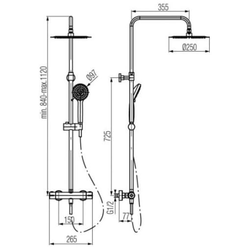 Dane techniczne: - średnica deszczownicy: 250 mm - wysokość drążka: 840-1120 mm - ciśnienie maksymalne: 1,0 MP - temperatura maksymalna: 90°C