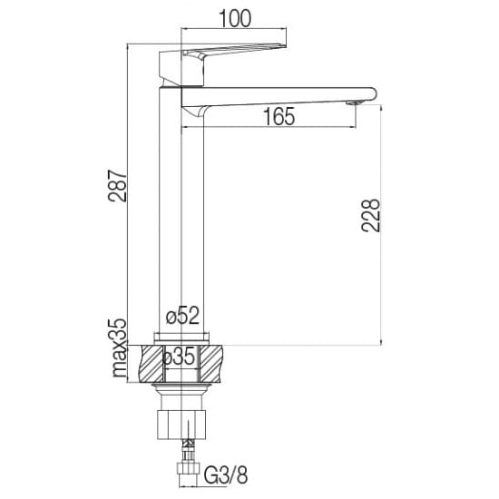 Dane techniczne: - przyłącza: G3/8 - zasięg wylewki: 165 mm - wysokość baterii: 287 mm - wysokość baterii do perlatora: 228 mm