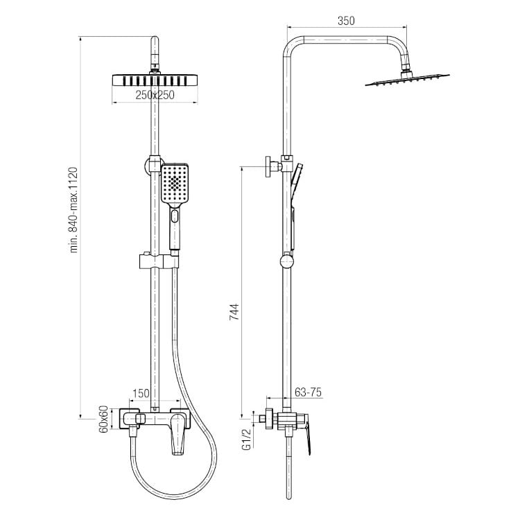 Dane techniczne: - wymiary deszczownicy: 250x250 mm - wysokość drążka: 840-1120 mm - długość ramienia natrysku: 350 mm - ciśnienie maksymalne: 1,0 MPa - temperatura maksymalna: 90°C