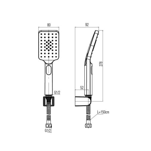 Dane techniczne: - wąż natryskowy: 1500 mm - długość rączki natrysku: 278 mm - szerokość rączki natrysku: 80 mm