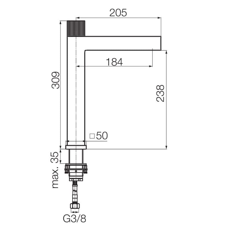 Dane techniczne: - wysokość baterii: 309 mm - zasięg wylewki: 184 mm - przyłącze: G 3/8